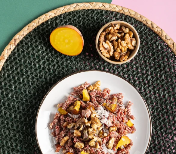 Rode bietenpasta wordt vaak bereid als (semi)verse pasta en heeft daarom een korte kooktijd. In dit recept ga je uit van ongeveer 4 minuten, maar volg altijd de aanwijzingen op de verpakking voor het beste resultaat.